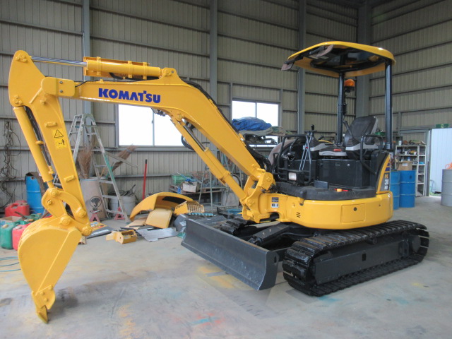 (分解・整備・点検報告)バケット、アーム、ブーム取付け周りピン、ブッシュ、シム調整整備、走行モーター減速機ギアオイル交換、エンジンオイル交換、オイルフィルター交換、燃料フィルター交換、エアークリーナー交換、ベルト類確認、冷却水確認、エンジン音・匂い・かかり具合良好、旋回モーター横ガタ・縦ガタ確認、各シリンダー確認、その他オイル漏れ・燃料漏れ確認、作動油フィルター良好、グロー(余熱)確認済、バッテリー電圧、チャージ確認、セルモーター回転速度確認、モニター・ライト・ホーン等電気系確認、クレーン作動確認、上部ローラー・下部ローラー・フロントアイドラー、ゴムパット及び鉄シュー・履帯回り良好、油圧ポンプ音・作業機スピード基準値合格、オーバーヒート負荷検査合格、総合検査合格